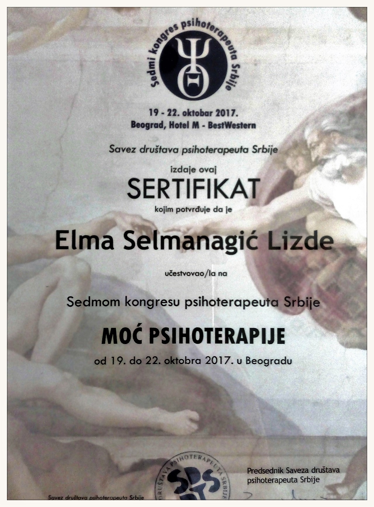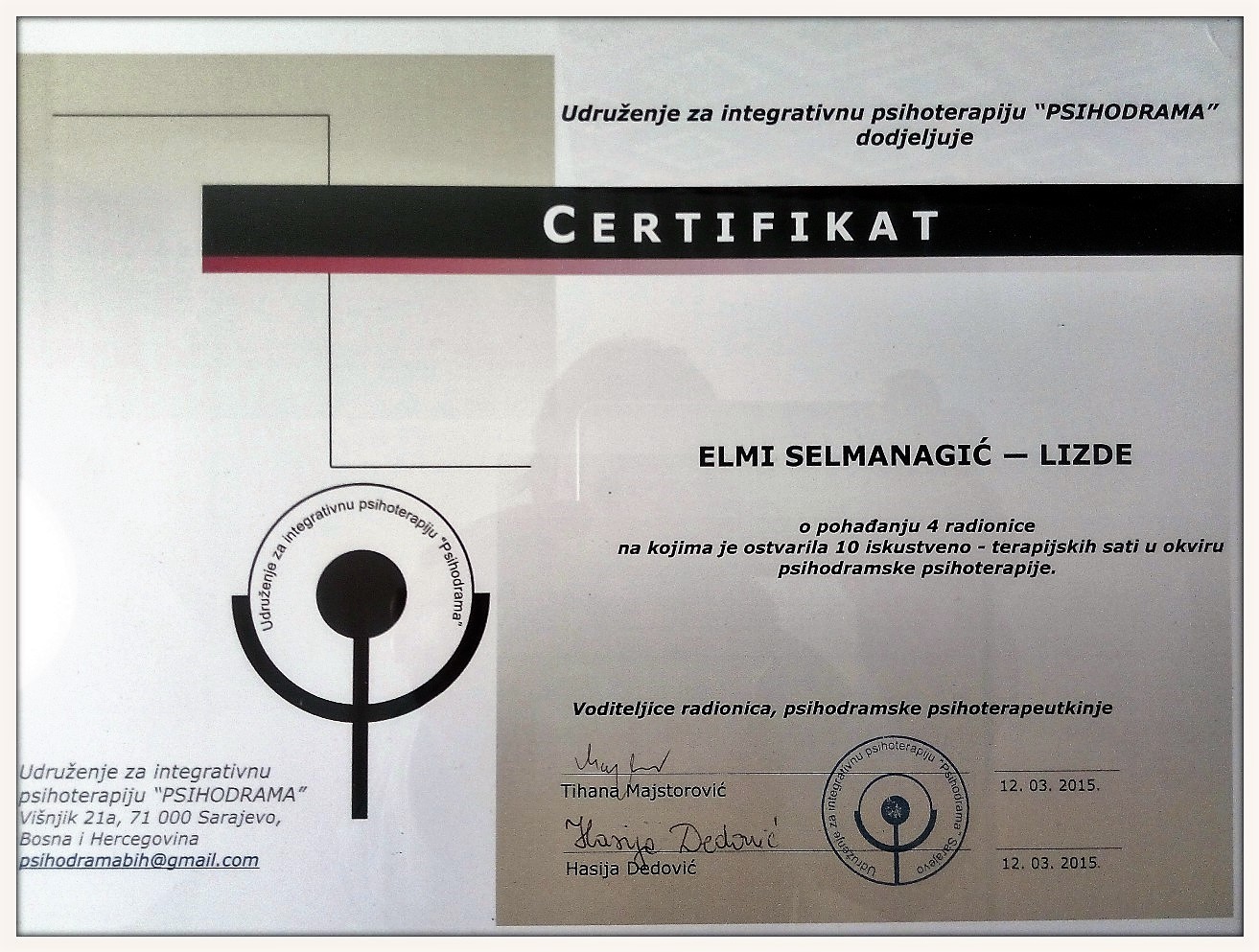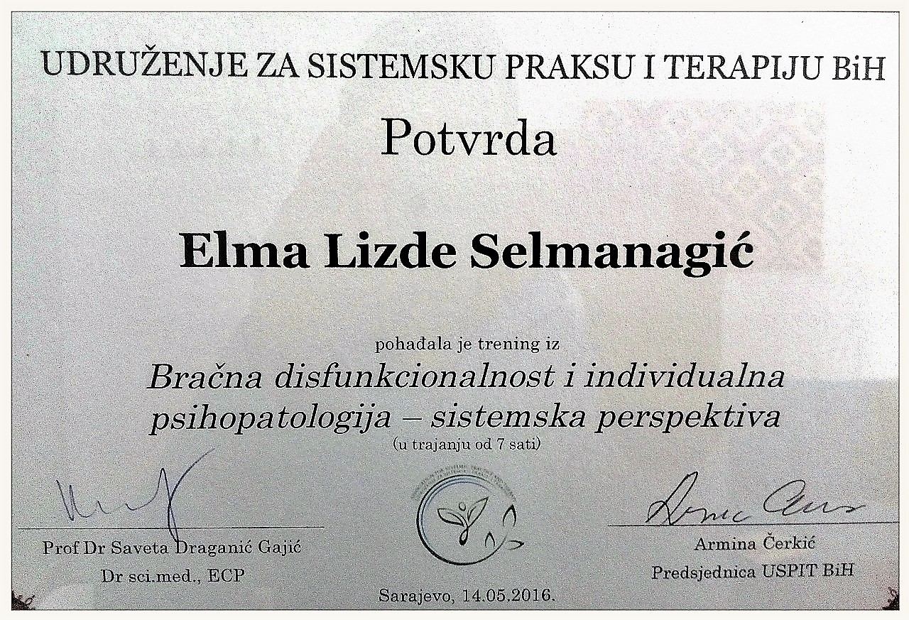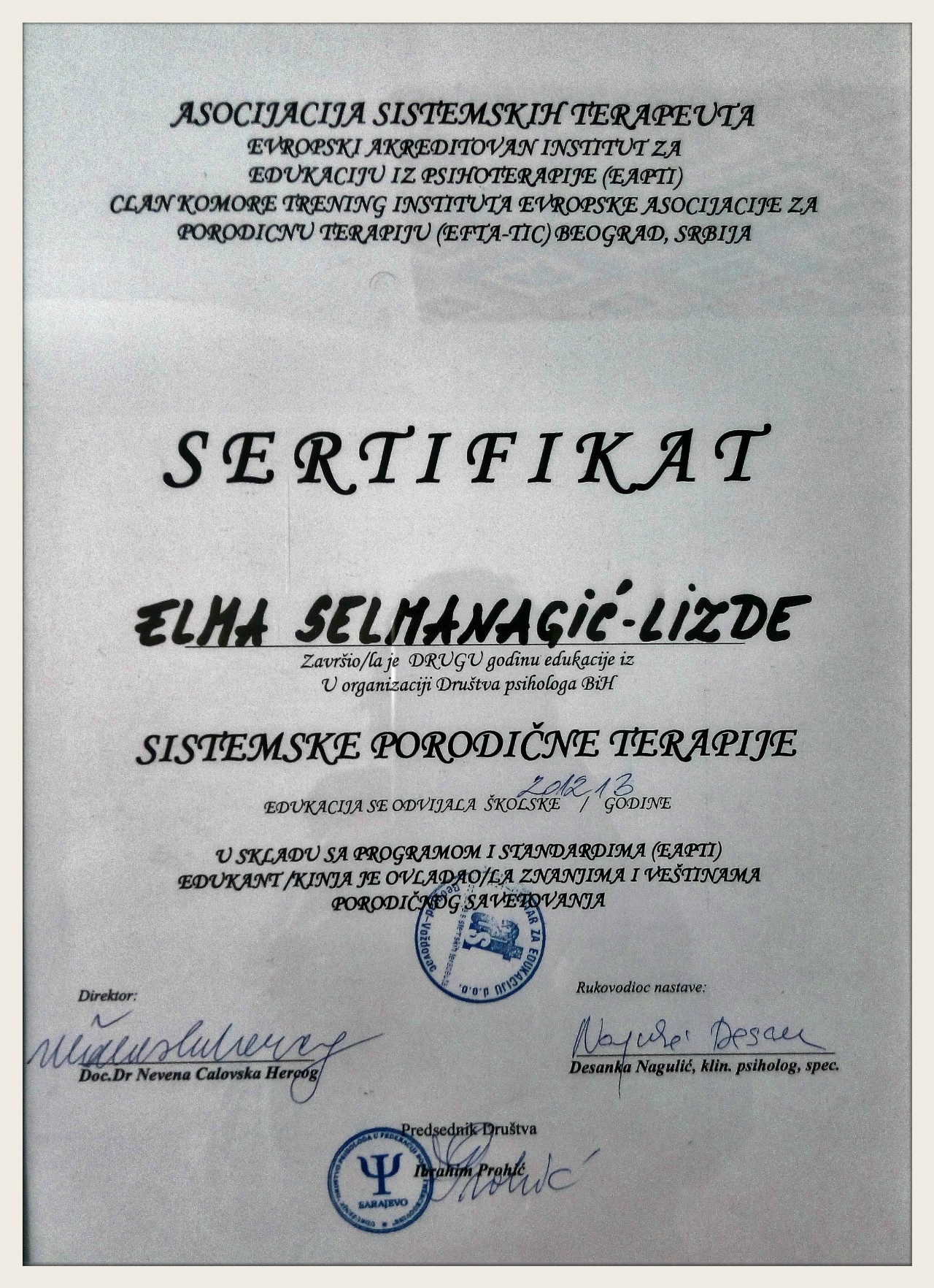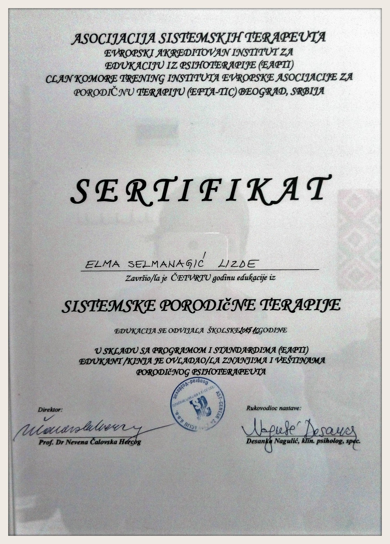 Usmjerenje na cjeloživotno učenje i želja za unapređenjem, kako vlastitog tako i porodičnog života dovela me do uloge porodičnog savjetnika i sistemskog porodičnog psihoterapeuta. Budući da su me jako zanimali procesi koji se odvijaju unutar porodice kao sistema, a posebno njenih pojedinačih članova, naročito braće i sestara, doktorirala sam iz oblasti pedagoških nauka baveći se, kroz svoju disertaciju, upravo tim odnosima koji mogu biti puni pažnje i ljubavi, ali i krajnje neprijateljski i opterećeni rivalstvom. Iskustvo bivanja u ulozi klijenta donijelo mi je dragocjenu spoznaju o tome šta znači „biti klijent“. S toga me iskreno raduju pozitivne promjene koje primijetim kroz psihoterapijski rad sa svojim klijentima. Psihoterapeut sam s iskustvom u savjetovanju i psihoterapiji, kako u individualnim terapijama, tako i u terapijama za parove, u radu sa porodicama i adolescentima. Kontinuirano sam u procesu psihoterapijske supervizije svoga rada. Također sam član Udruženja za sistemsku praksu i terapiju BiH koje je članica Evropske asocijacije za porodičnu terapiju (EFTA) http://www.europeanfamilytherapy.eu/.